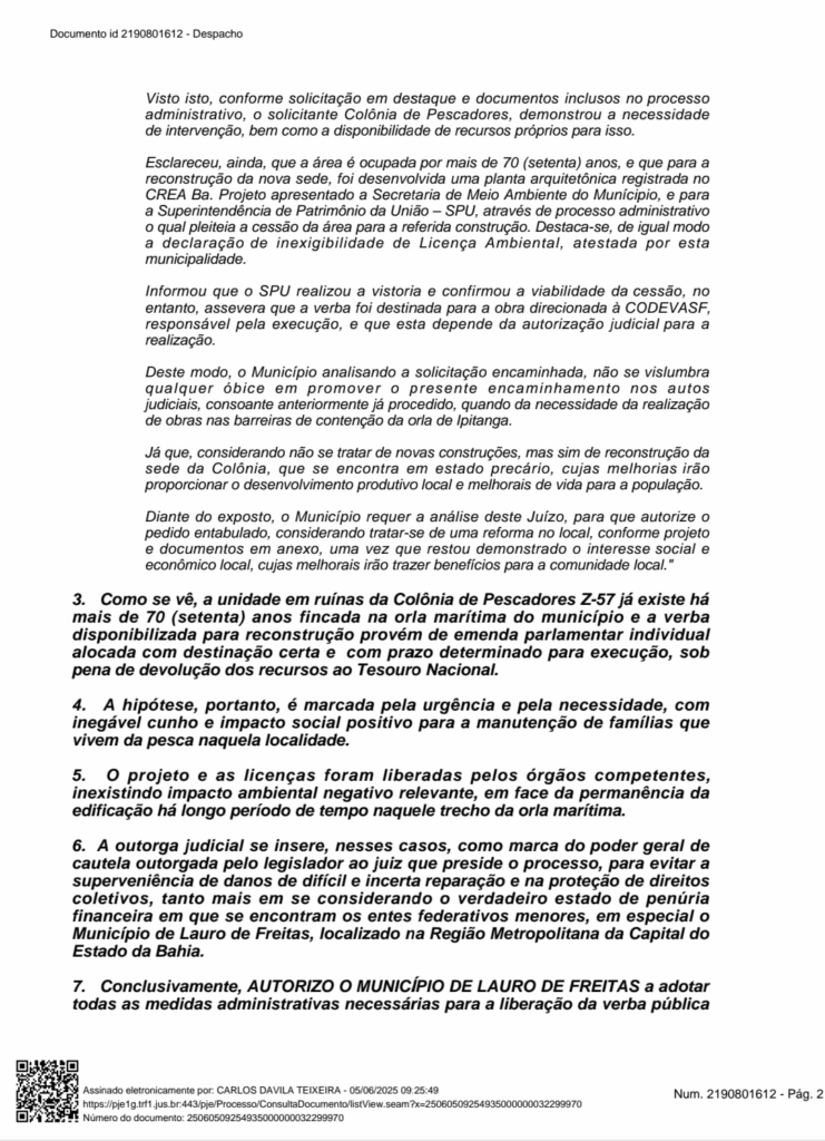 DESPACHO DO JUIZ SOBRE A REFORMA DA COLÔNIA E PESCADORES DE BURAQUINHO